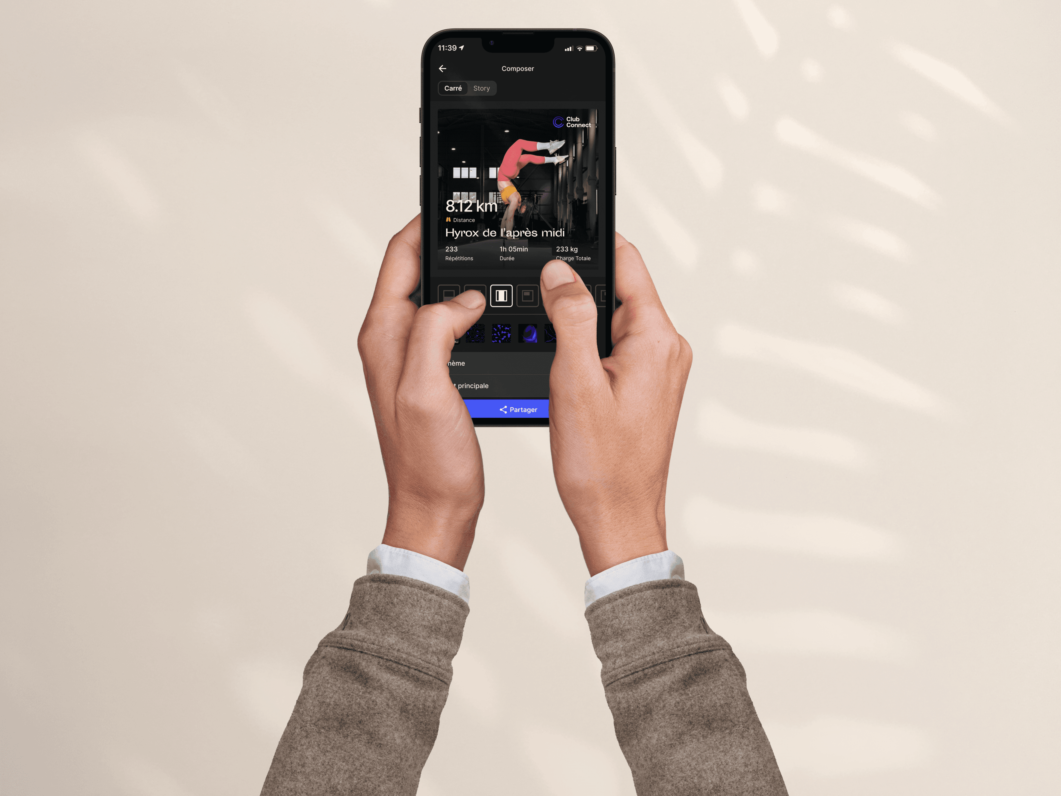 Vos membres peuvent désormais transformer chaque séance d'entraînement réalisée en contenu partageable. Avec une interface intuitive, ils sélectionnent leur meilleure photo, personnalisent l'affichage de leurs statistiques (durée, calories, charge totale...), choisissent parmi plusieurs templates et formats (carré pour Instagram, story pour les réseaux sociaux), et partagent le tout en un clic.